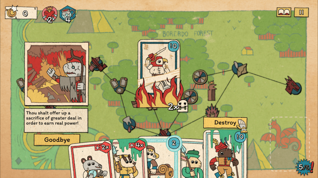 La jugabilidad de The Royal Writ es el corazón de su propuesta, y es en este aspecto donde el juego ofrece mayor complejidad, interés y también ciertos hallazgos problemáticos. Se juega como un deckbuilder táctico por carriles (lane-based): las cartas representan sujetos animales que se colocan en carriles específicos y marchan hacia el frente enemigo. Si alguna carta llega a la base del oponente, esa carta se considera destruida permanentemente y se elimina de la baraja para el resto de la partida. Este elemento de muerte permanente de cartas convierte cada decisión en algo más profundo: ya no basta con optimizar el mazo, sino que se debe anticipar pérdidas inevitables y construir la partida con márgenes de tolerancia.