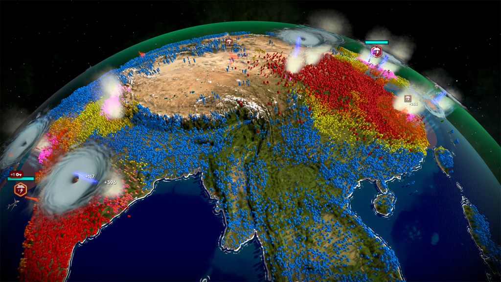 En mi impresión, aunque una historia densa no es necesaria para que el juego funcione, esa liviandad narrativa le resta un punto de peso emocional. Cuando uno provoca olas de destrucción masiva, el impacto dramático es mayor si siente que hay una lógica, una causa o incluso una resistencia con identidad. Aquí esa resistencia —la humanidad intentando sobrevivir— existe desde lo mecánico, pero no adquiere voz ni rostro definidos. Así, el jugador opera más como una fuerza impersonal que como antagonista con carácter. Eso no impide que las escenas de colapso —cuando el mundo responde con epidemias, guerras o movimientos humanos desesperados— terminen siendo memorables, pero se echa en falta ese pegamento narrativo que aporte un componente simbólico o moral más pronunciado.